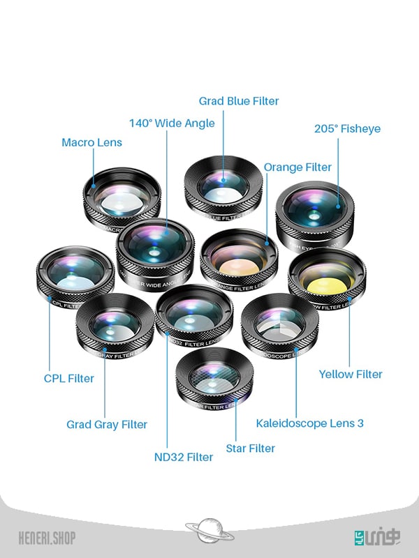 لنز Fish Eye Lens 205°، لنز ماکرو، لنز فوق عریض 140 درجه، فیلتر Kaleidoscope، فیلتر ND32، فیلتر CPL، فیلتر ستاره، فیلتر Grad Gray، فیلتر Grade Blue، فیلتر Yellow Filter، فیلتر Orange Filter